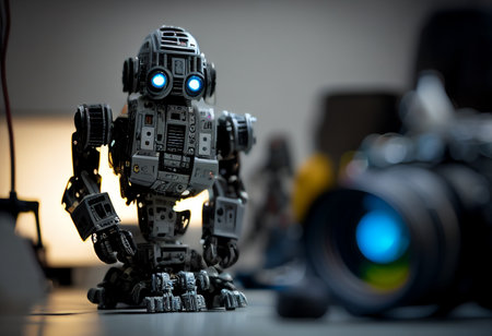Camera and robot outling the controversy over artificial intelligence generated photography pictures and images through automated deep learning, computer Generative AI stock illustration photo