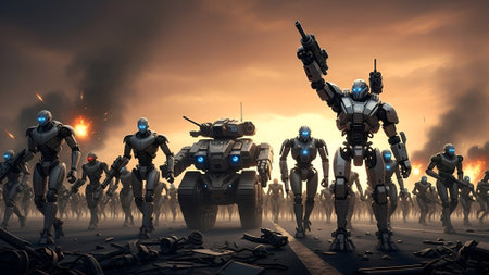Futuristic battle robots and soldiers with glowing blue lights advancing in a war-torn landscape during sunset, creating a dramatic and intense atmosphere for military and technology marketing.