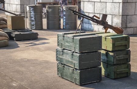 training large-caliber cartridges from the gun in the tape are on wooden boxes