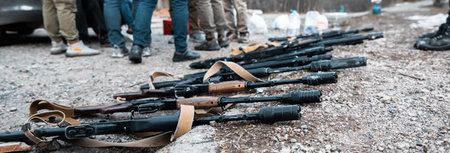 War guns arsenal modern military assault rifles shotgun weapon arms outdoors on natural background