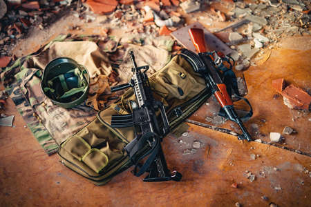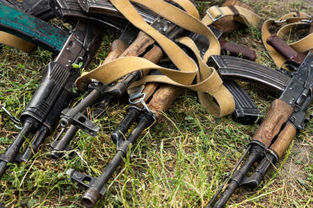 Automatic, hand gun, machine gun, helmet and body armor piled in a heap, lying on the ground. The zone of military operations.