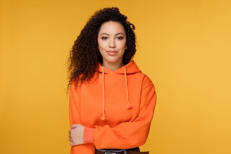 Stock photo of beautiful afro women posing in studio shot against brown background.
