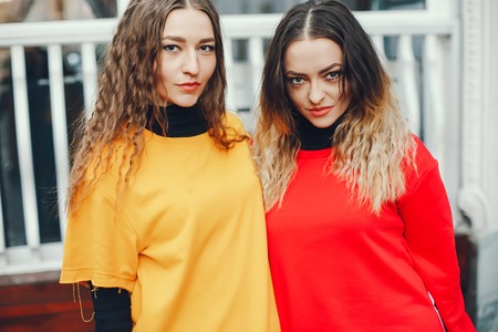 Portrait of a pair of beautiful fashionable Spanish girls standing against a texture wall. Fashion photography Street art
