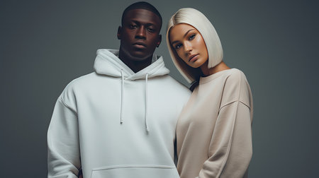 a stunning African couple wearing plain hoodie mockups in a well-equipped photo studio, demonstrating style and comfort