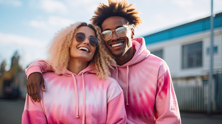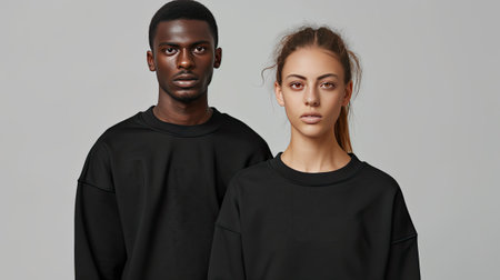 black male and female models standing side by side, black sweatshirts confident poses and stylish attire, the versatility and appeal of black clothing