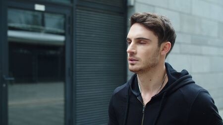 Portrait of young man walking street in black sweatshirt. Close up attractive guy in hoodie on street. Focused man going in urban street in slow motion.