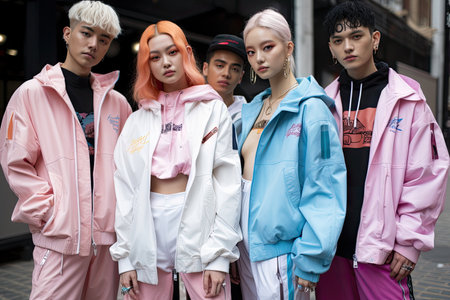 Four fashionable individuals, each wearing unique streetwear outfits, exude confidence and modern style against a textured backdrop. The vibrant colors and bold designs reflect the essence of urban fashion, appealing to trendsetters and style enthusiasts alike.