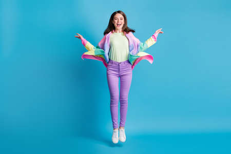 Beautiful young brunette in a yellow oversize hoodie having fun and jumping, portrait on a blue background