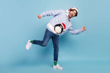 Full length photo of happy cheerful positive man good mood runner holiday sale isolated on blue color background