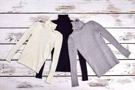 Set of turtleneck knitted sweaters. Collection of new colored thick turtleneck sweaters for children, top view.