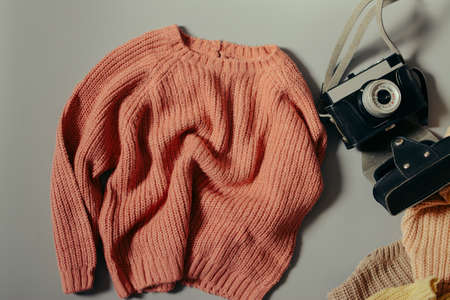 Discover a stylish flat lay featuring a cozy knit sweater, white sneakers, a vintage camera, and soft textures, perfect for fashion inspiration and lifestyle.