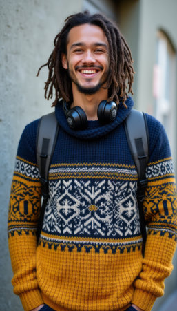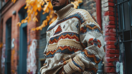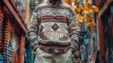 A close-up portrait of an individual dressed in eclectic grandpa style, standing against a backdrop that blends urban and vintage aesthetics. They wear a soft, patterned knit sweater, high-quality loafers, and classic trousers with a contemporary fit.
