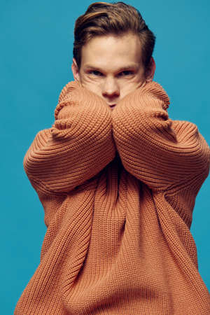 a hilariously funny guy pulling a sweater over his face, standing sideways to the camera. Horizontal studio photo with empty space on the background for an advertising layout
