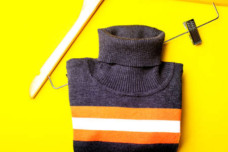 Warm knitted sweater hanging on a wooden clothes hanger in a room