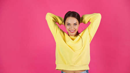 smiling young adult woman in yellow sweatshirt adjusting hair with hands isolated on pink