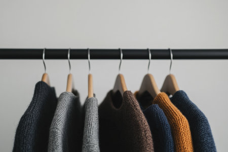 A curated display of sweaters hangs elegantly on a minimalist rack, highlighting calm neutral shades.