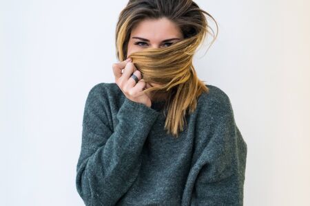 Portrait of a beautiful young woman in a white sweater on a light background.