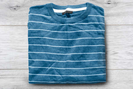 Yellow folded sweater. Pullover with collar on bright wood background.