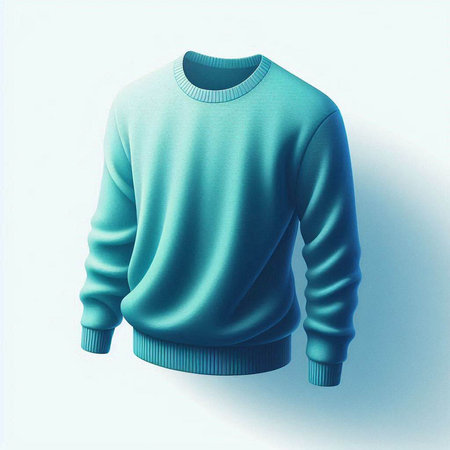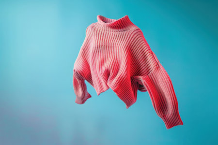A vibrant pink knitted sweater floating against a soft blue background, showcasing its unique texture and contemporary design