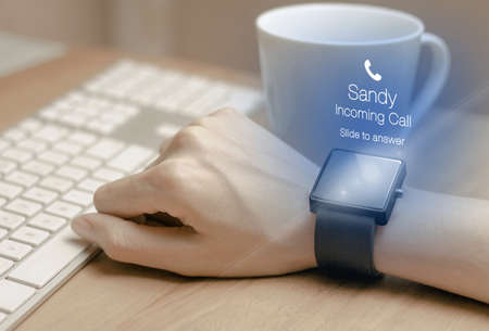 Incoming call icon with smartwatch. A smartwatch is a wearable computing device that closely resembles a wristwatch or other time-keeping device.