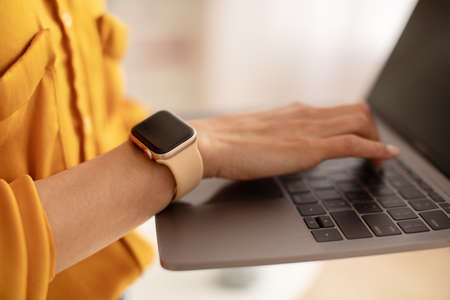 Closeup of woman hands wearing smart watch