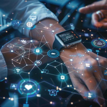 A modern smart watch showcases futuristic holographic data, emphasizing technology's role in business analytics and user interaction in an urban setting.