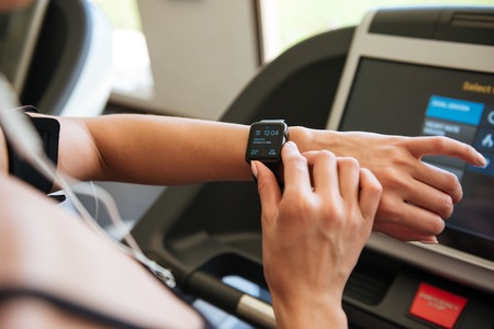 Girl using sport smart watch, doing cardio exercise on treadmill in gym