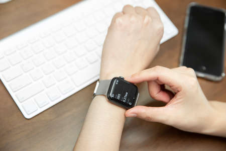 Bali Indonesia June 2, 2020 : female hands using with apple, Apple Watch is a line of smartwatches designed, developed, and marketed by Apple Inc.