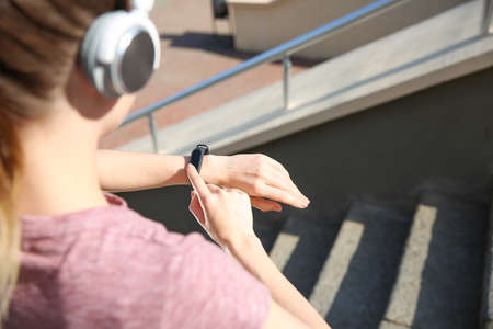 Close up shot of young woman setting and looking at sports smartwatch. Fitness female checking her performance.