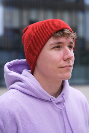 Portrait of young happy man or teenager in hoodie and hat looking at camera outdoors