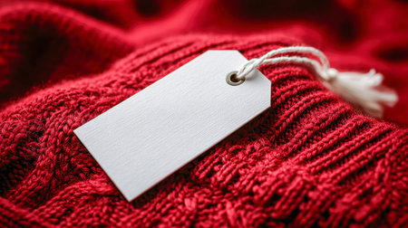 A plain white tag with a tactile surface rests atop bold, handcrafted red knitting, evoking warmth and charm perfect for winter gift or fashion displays.