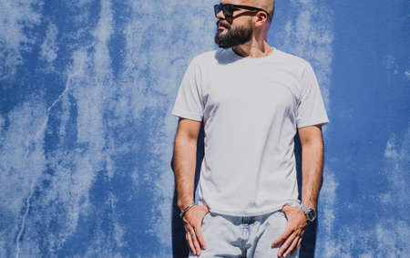 Male model with beard wearing white blank t-shirt on the background of an blue wall