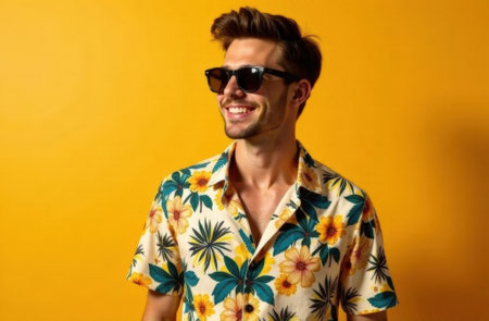 A man stands confidently wearing a bright yellow raincoat and matching sweater, contrasting beautifully against a clear blue sky with fluffy clouds, showcasing fashion and attitude