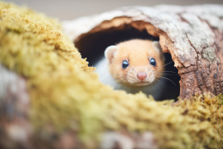 A curious weasel peeks out from a hollowed log, showcasing its inquisitive nature in a tranquil forest setting filled with natural beauty.