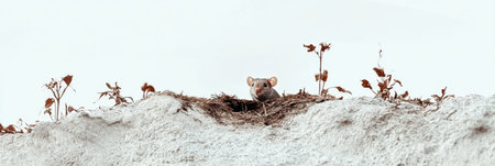 A small mouse curiously pokes its head from a burrow, surrounded by a minimalist white landscape, signaling its readiness to explore.