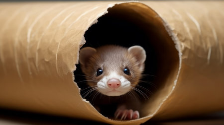 A mischievous ferret peeking out of a cardboard tube. AI generated illustration
