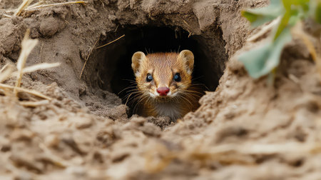A charming weasel peeks out from its sandy burrow, exhibiting curiosity and alertness in its natural habitat. This captivating wildlife moment highlights the unique personality and agile nature of this small mammal.