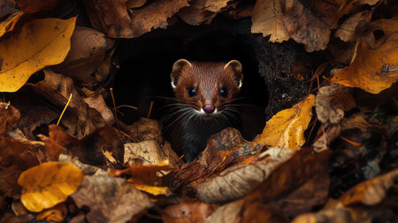 A charming weasel peeks out from a nest made of vibrant autumn leaves, showcasing its curious expression in a serene forest setting.