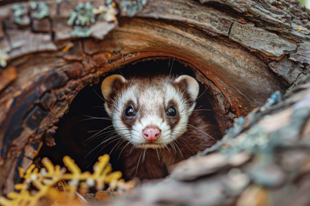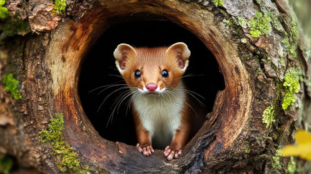 A charming weasel curiously peers out from the hollow of a tree, showcasing its vibrant fur and expressive eyes in a serene autumn forest setting.