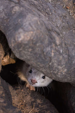 Stoat peeking its face from a rock crevice, looking directly at viewers