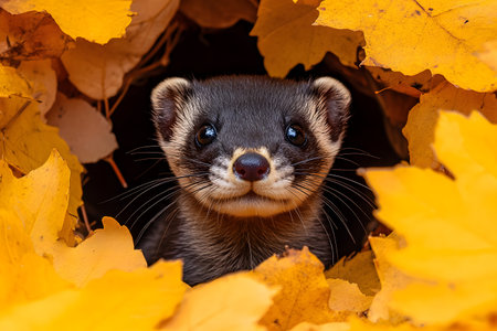 A curious ferret peeks through a bed of vibrant orange and yellow autumn leaves. the scene essence of fall with warm tones and the endearing expression of the ferret amidst nature's colorful backdrop. Generative AI