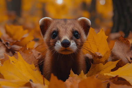 A playful ferret pokes its head through a vivid display of golden autumn leaves. the contrast of the animal's fur against the rich yellow foliage highlights the enchanting beauty of autumn wildlife and natural exploration. Generative AI