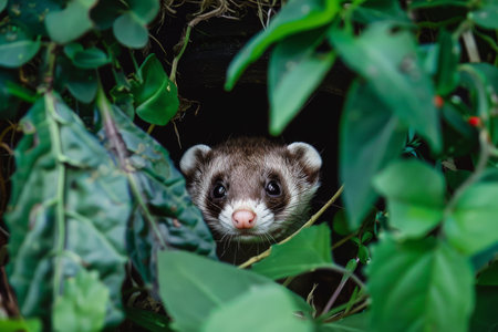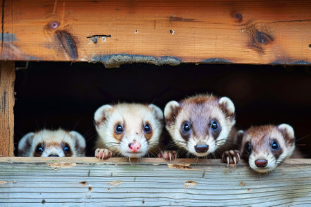A ferret peeks out from beneath a wooden structure, embodying its playful spirit and natural curiosity, A playful ferret peeking out from a hiding spot, Ai generated