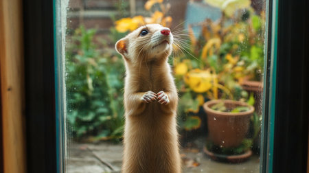 A curious ferret stands on its hind legs, gazing through a glass window. Its adorable expression and soft fur glisten in the natural light, surrounded by a beautiful garden.