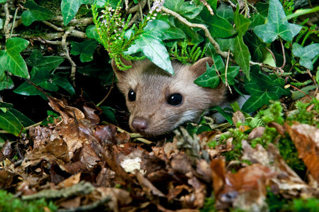 alert weasel with bright eyes peeking from a leaf-covered hole