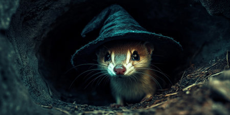A sneaky weasel wearing a crooked witch hat, darting through a dark, mysterious underground tunnel.
