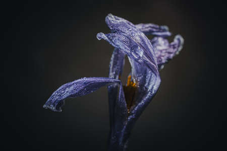 Old withered yellow tulip on a dark background, Past beauty with abstract fragility