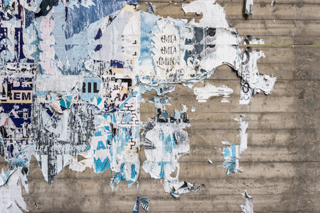 Concrete wall with colorful ripped bill posters. Grunge background