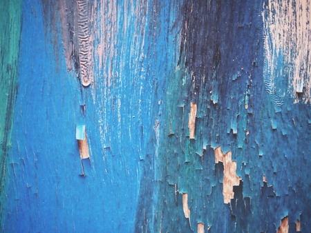 Blue peeling paint on wooden surface. Abstract background for design.