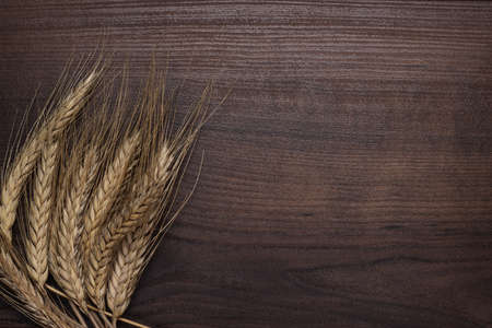Bunch of spikelets of wheat on brown background. Flat lay.